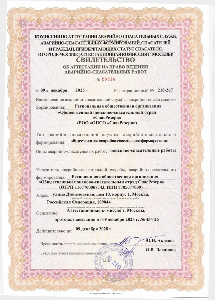 ОПСО «СпасРезерв» аттестован на право проведения аварийно-спасательных работ. Свидетельство № 01203 от 12.12.2019 рег. № 210-267